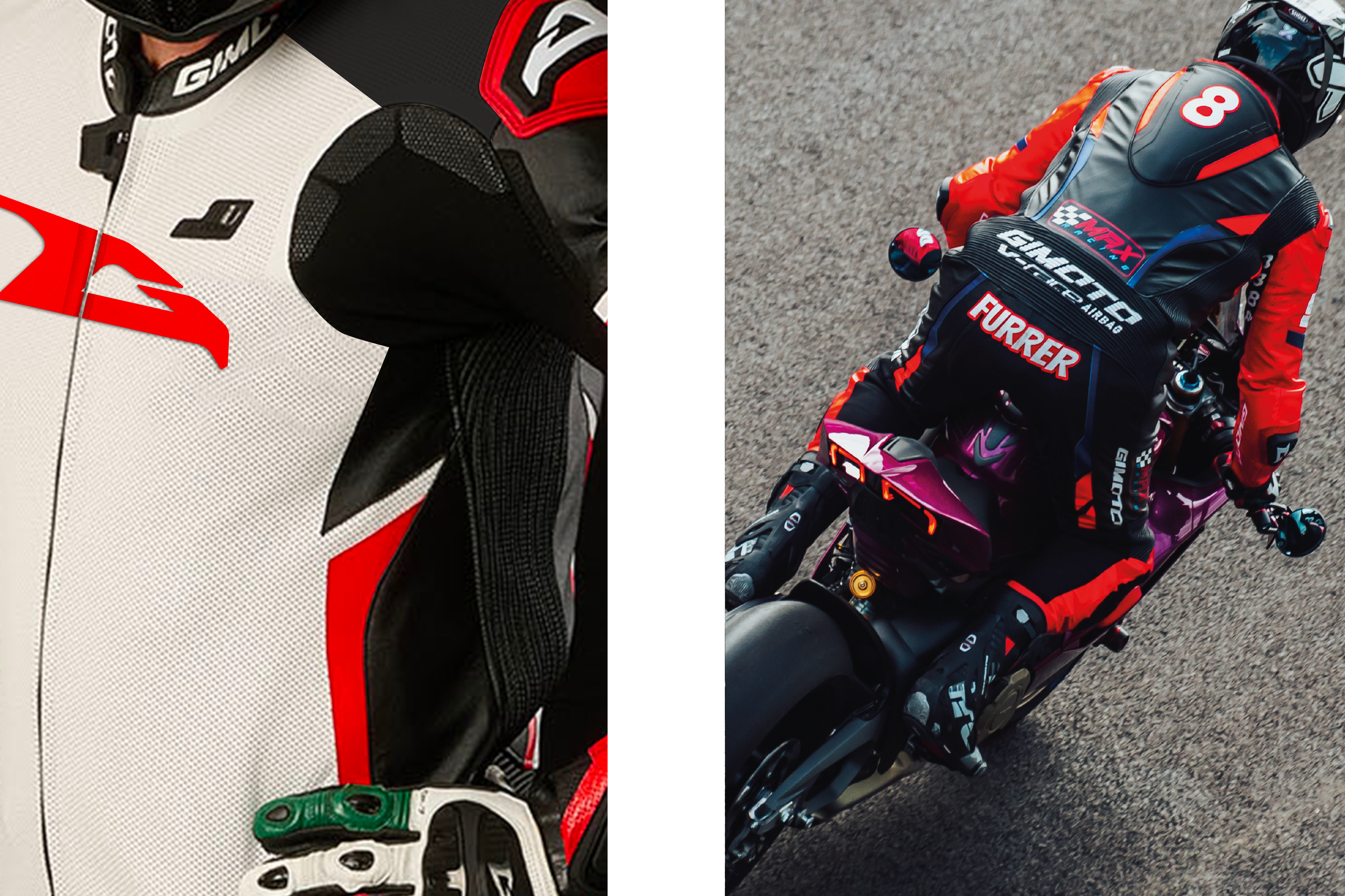 Tailor-made and customizable The suit can be made to measure and customized with colors, finishes, accessories, sponsors, and logos. It is compatible with Gimoto's V-RACE RR airbag system and other airbag systems.